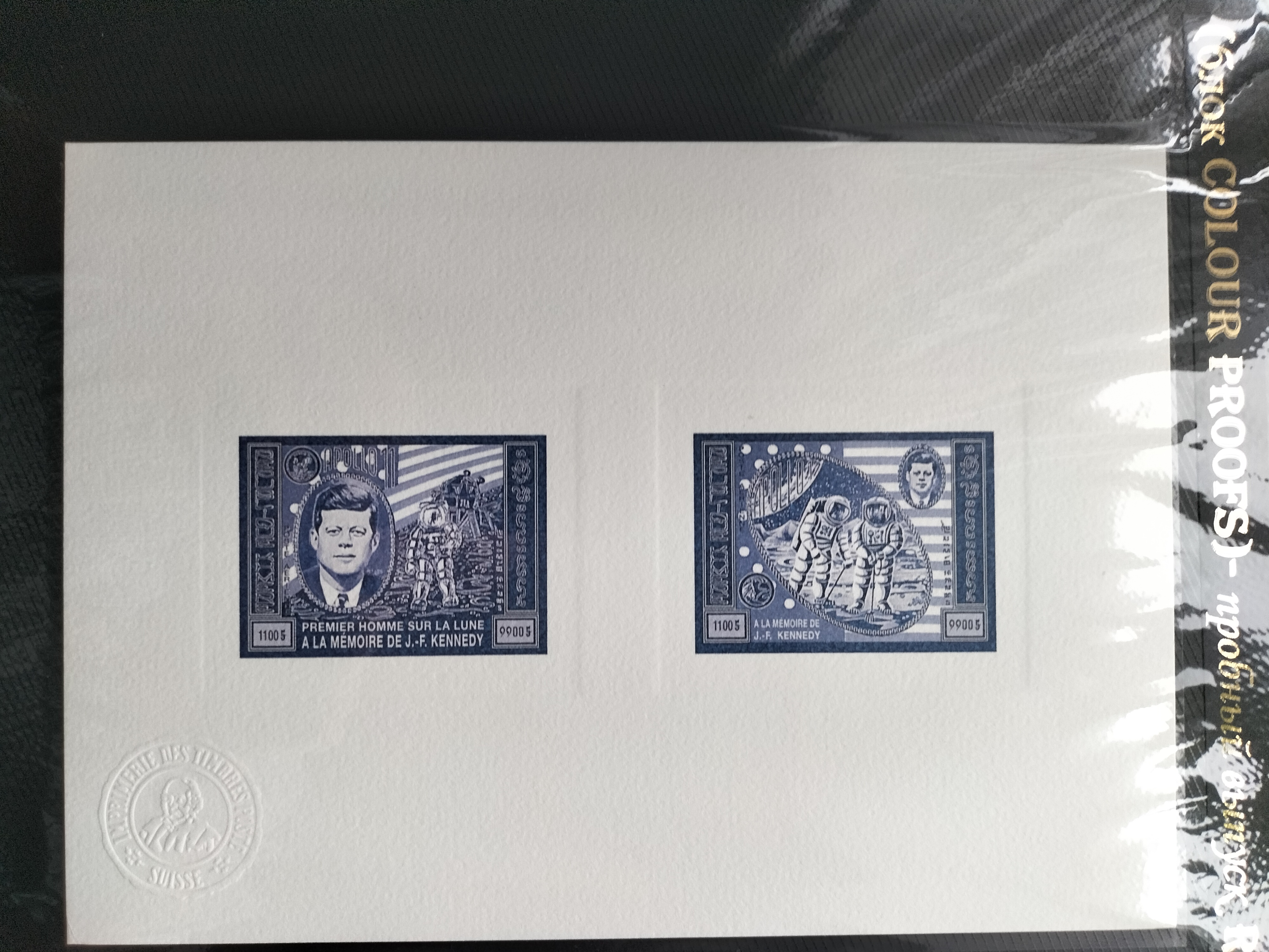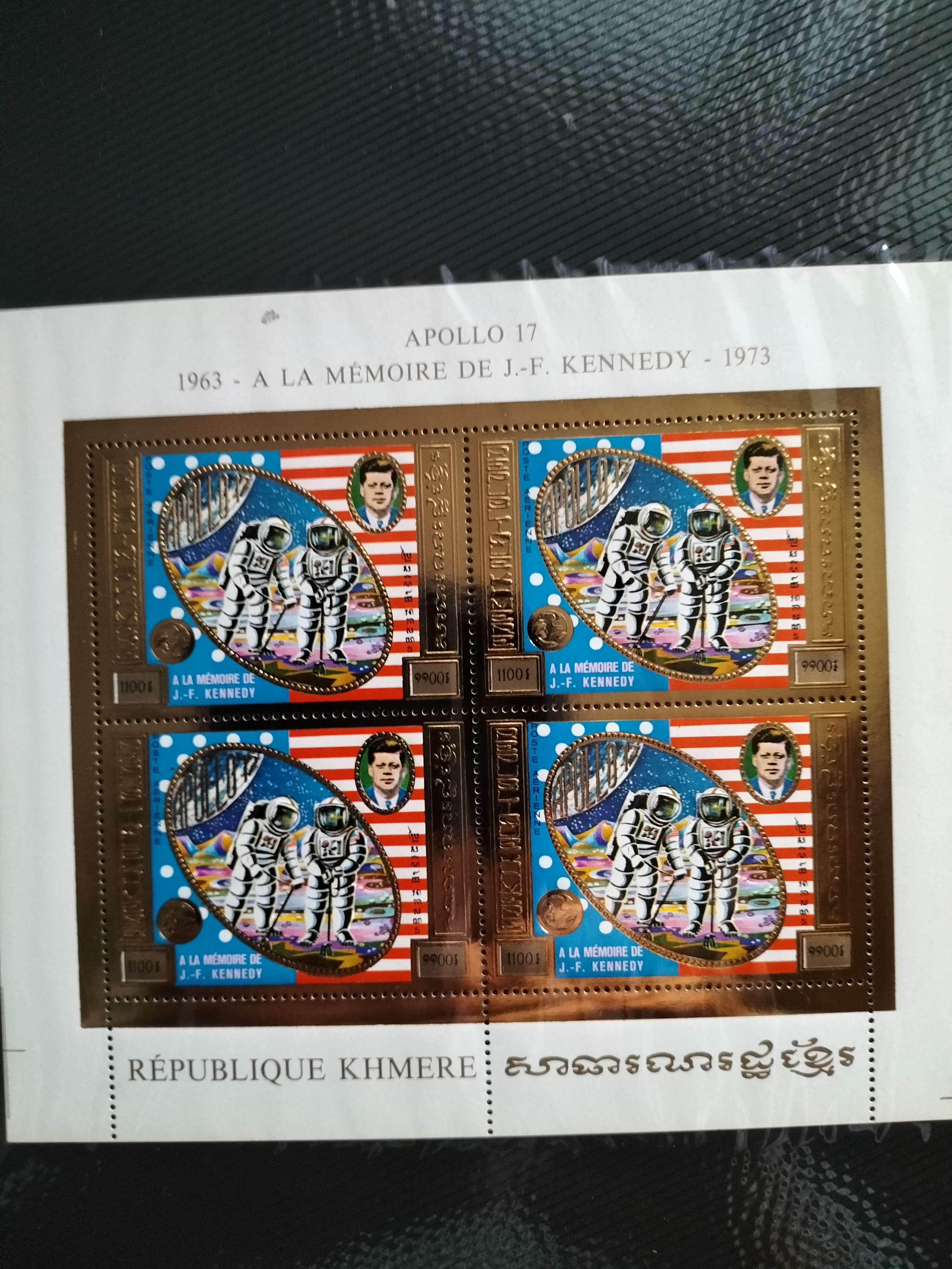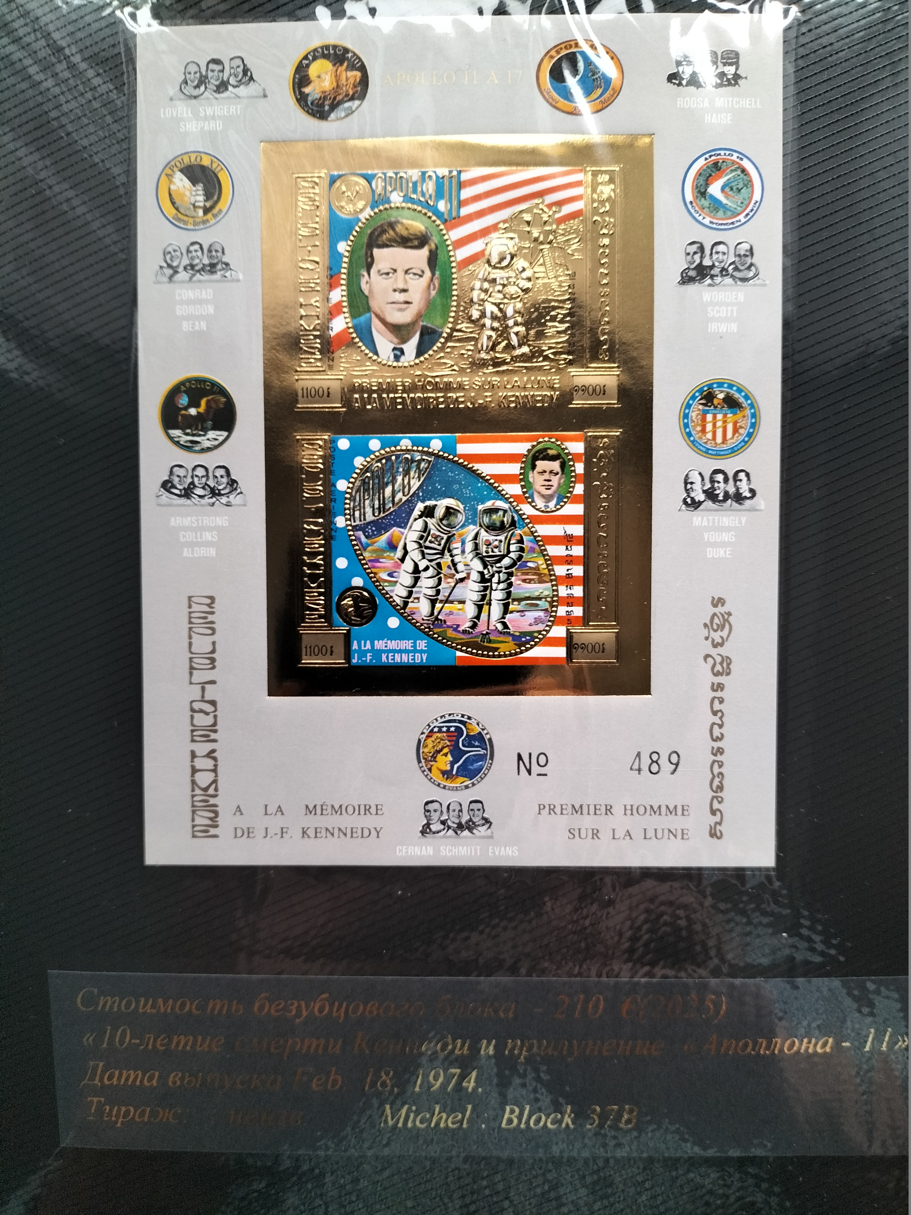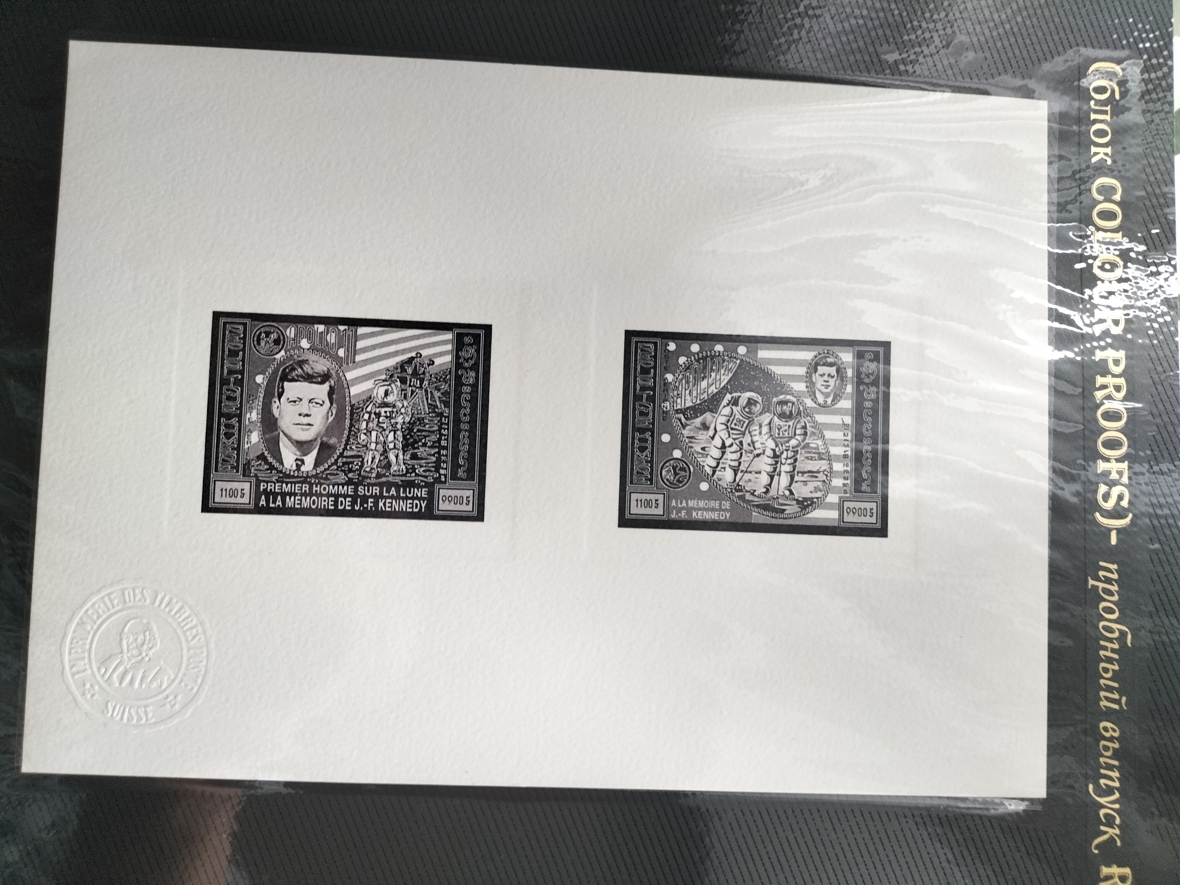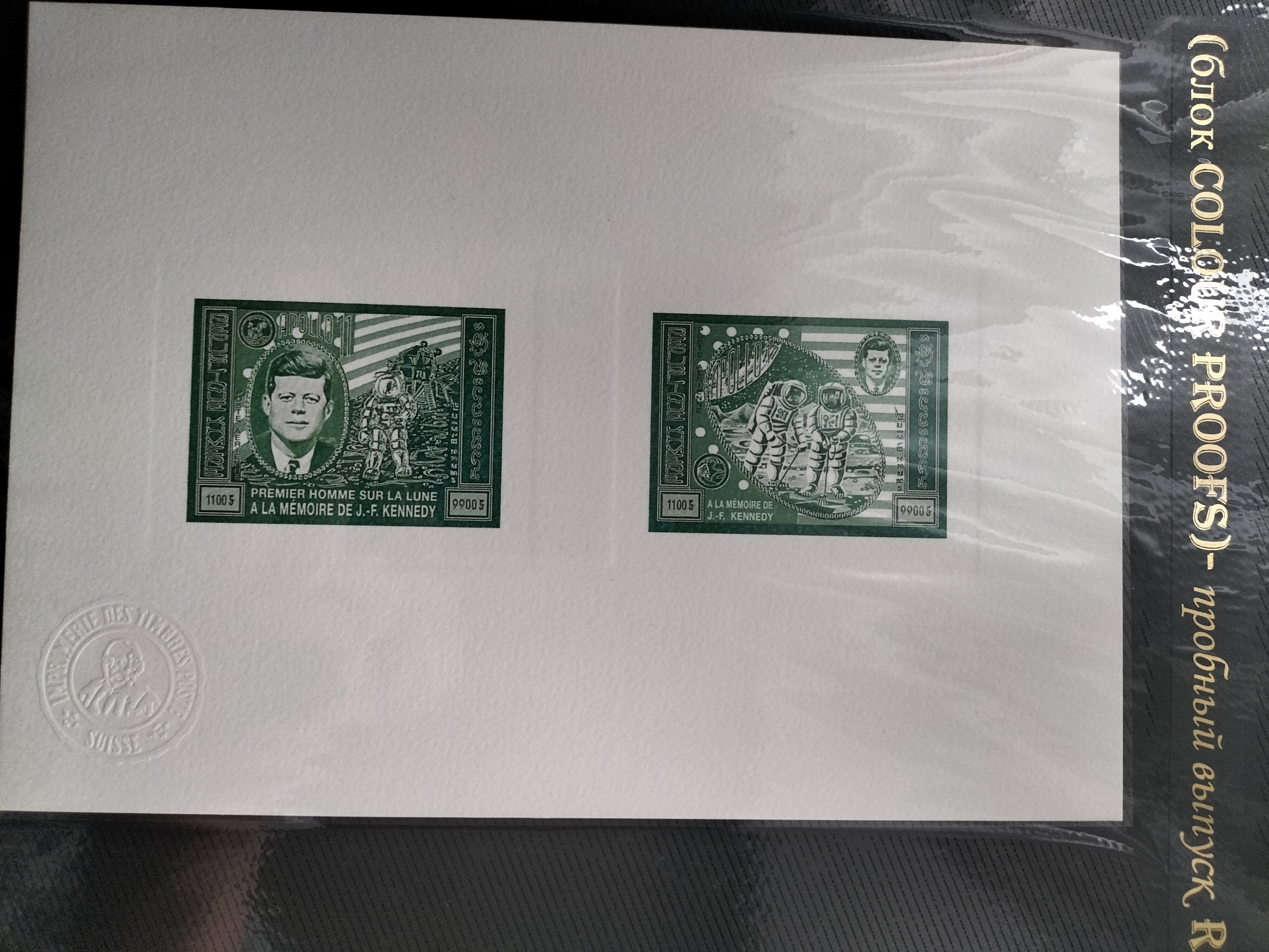 В описании указано: «Apollo 11, 10th anniversary of Kennedy`s death, astronauts.» На самом деле на марке четко указывается Аполлон -17 и дается эмблема полета. Именно Аполлона -17. Марки выпускались в составе квартов. И у беззубцовых марок и блоков тираж был сравнительно небольшой – 600 экземпляров. У зубцовых – побольше 3000 экз.