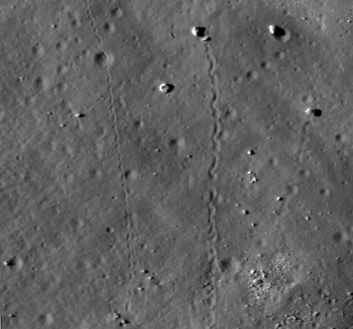 В связи с новогодними праздниками пока перерыв в обсуждении. Впрочем, парочку фотографий поверхности Луны со спутника LRO интересно посмотреть. Тут есть все: и длинные и пересекающиеся следы от "катящихся?" камней и пресловутые "цепочки маленьких кратеров". Верхнюю фотографию можно сильно-сильно увеличить и вы увидите кучу длинных следов. На каком-то форуме писалось,что длина следа около 10 км. Не знаю, масштаба нет.