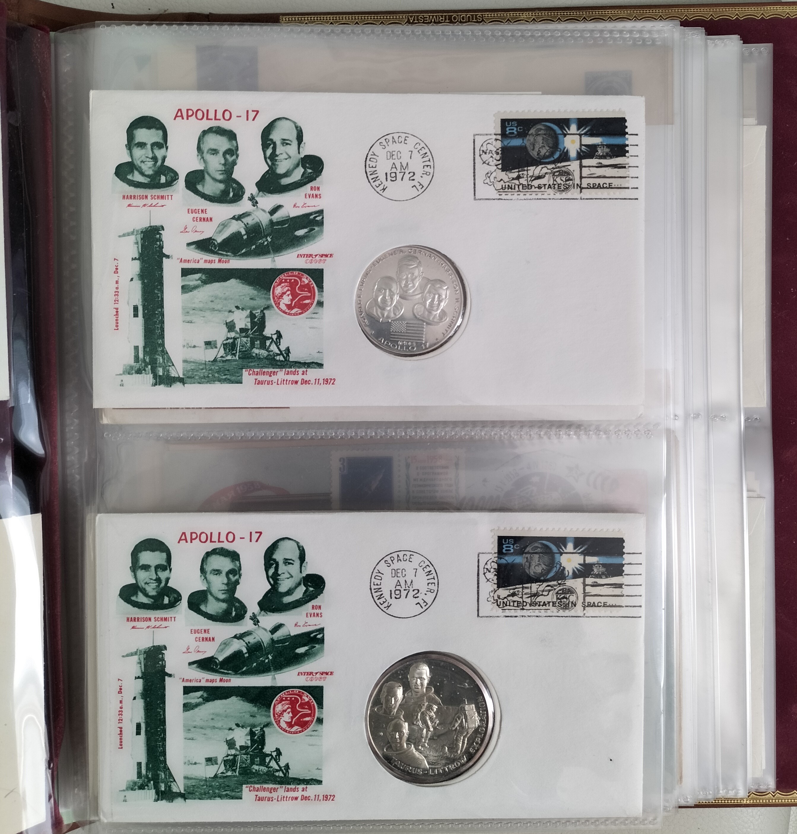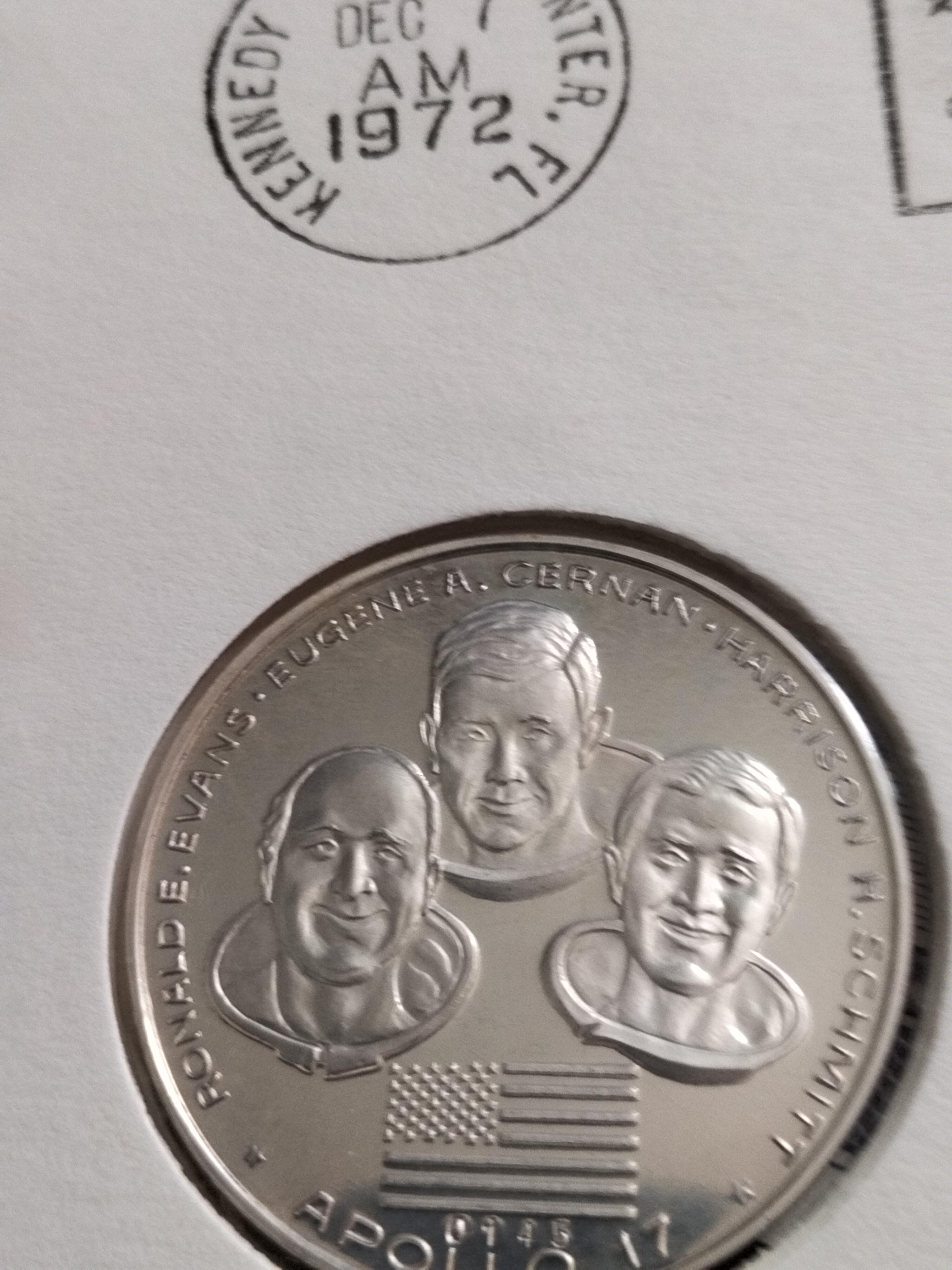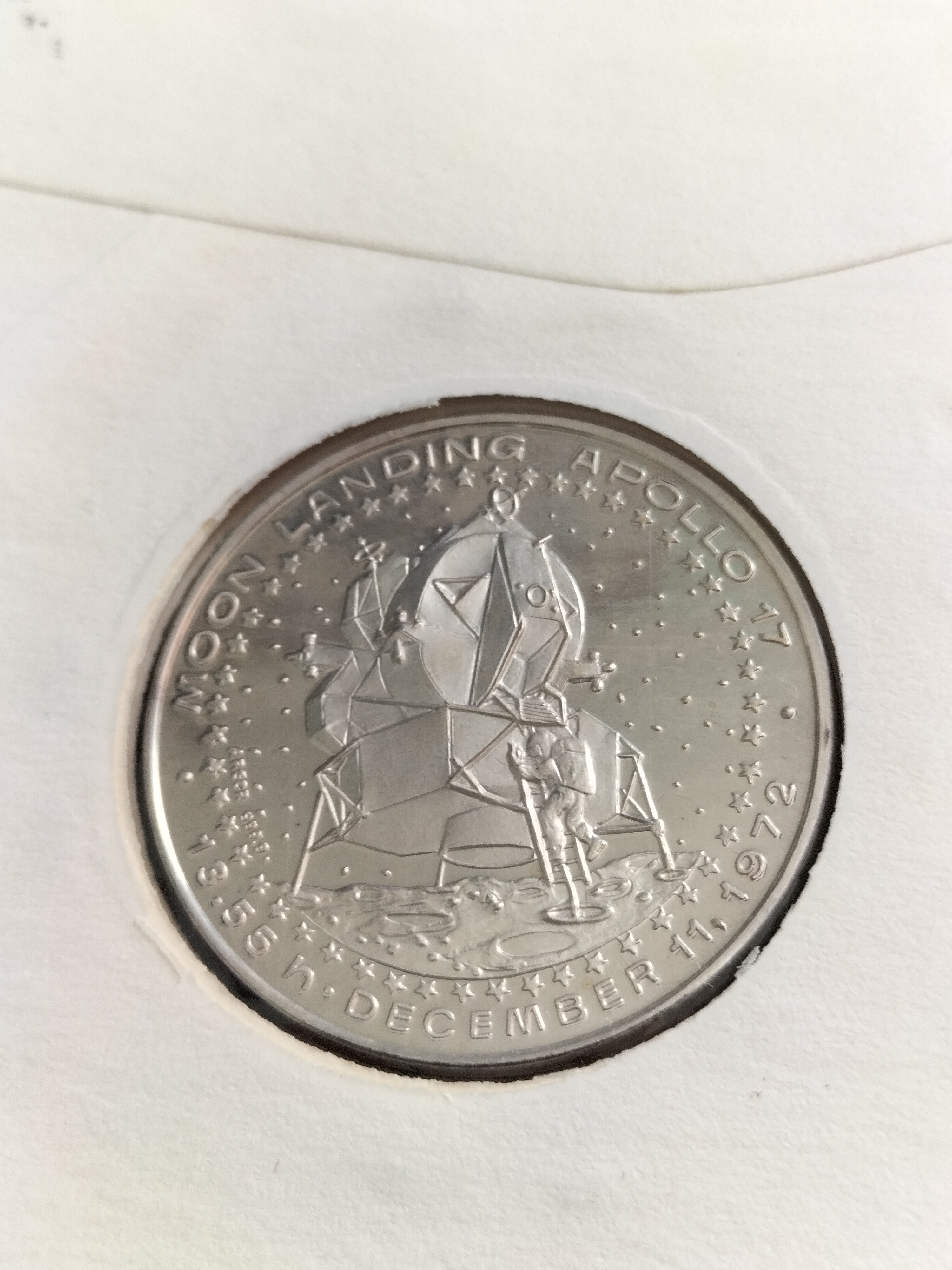 Что-то филателистическое надо добавить. Вот парочка конвертов Аполлона 17 из коллекции Андрея Николаевича (сейчас перекочевало ко мне). Конверты с серебряными медалями. Тираж медалей , судя по выбитому трехзначному номеру - небольшой. Кому вручали медали , точно не знаю. Но на ебэе такие медали , если и продаются,то уже темные вследствие образования сульфида серебра из-за содержащейся в воздухе серы. Здесь ,в конвертах , они хранятся почти в качестве "пруф",что приятно...