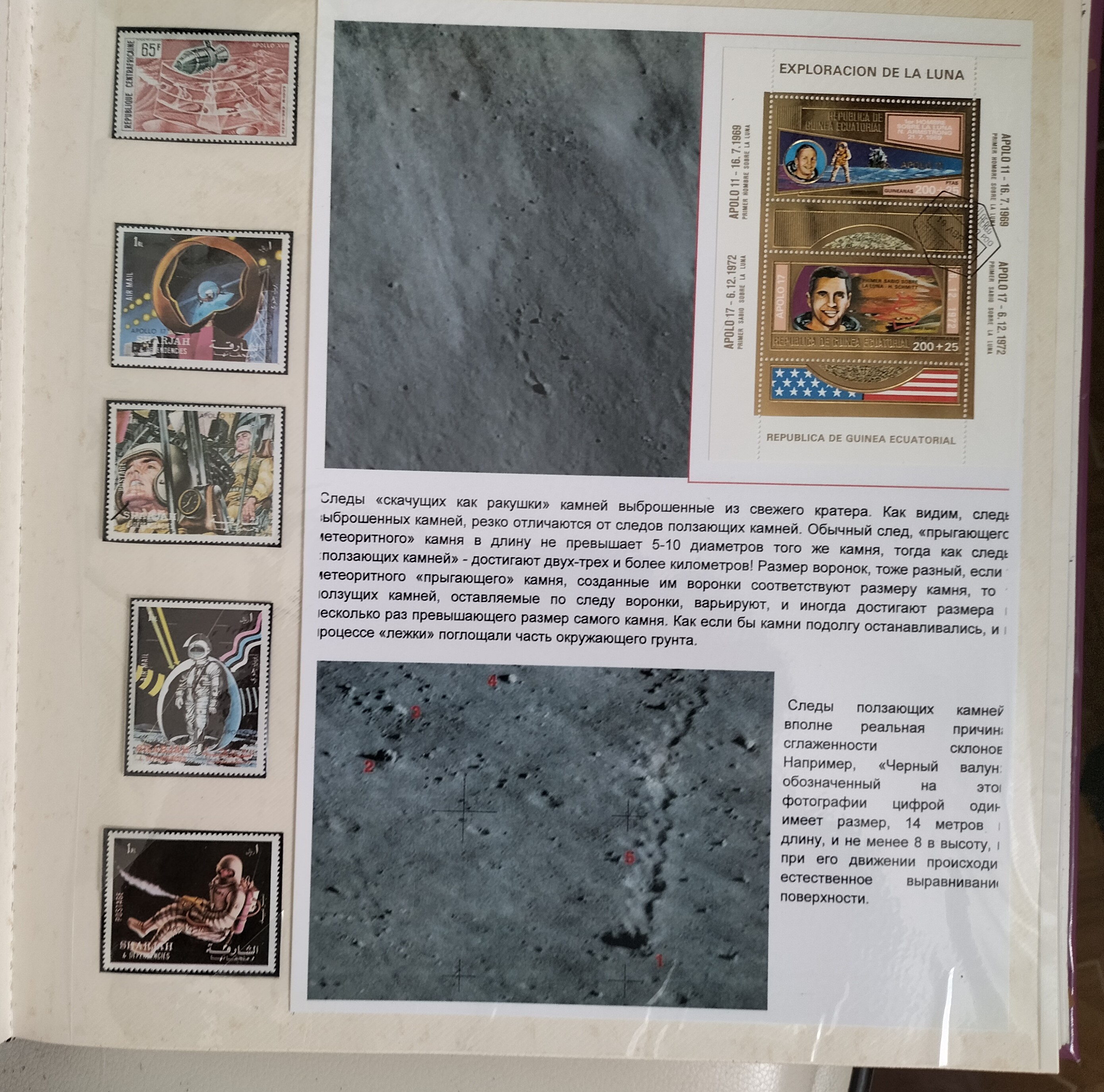 «…астронавты видели и фотографировали совершенно натуральные следы и кизяки! Кроме того в результате обобщенных исследований обнаружен чрезвычайно странный характер самих камней, как сфотографированных на Луне, так и доставленных на Землю. ….астронавты Аполлон-17, при каждом выходе видели (и фотографировали) следы и долго по километру и более петляли по холмам и меж холмов по этим самым следам. И каждый раз, выходя из LM (Лунный Модуль) и садясь на ровер, они ехали вдоль очередного найденного ими следа. И «не скатившегося с холма камня», а натурального следа округлых отпечатков, тянувшихся размеренной цепочкой, справа и слева относительно условной линии. Периодически между следами астронавты находили «коровьи лепехи», которые они так и называют «сухими экскрементами» и «лужицами застывшего стекла».