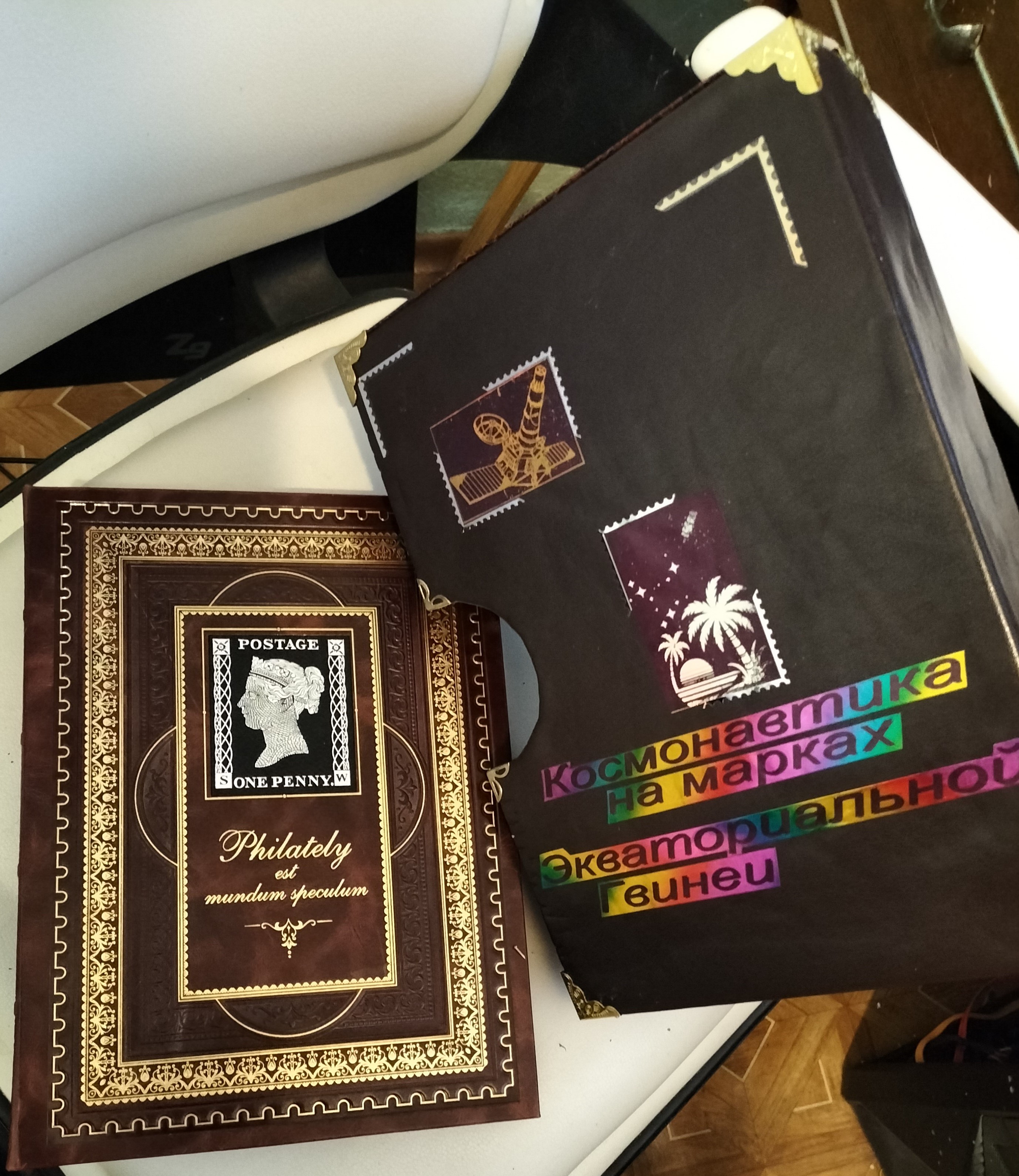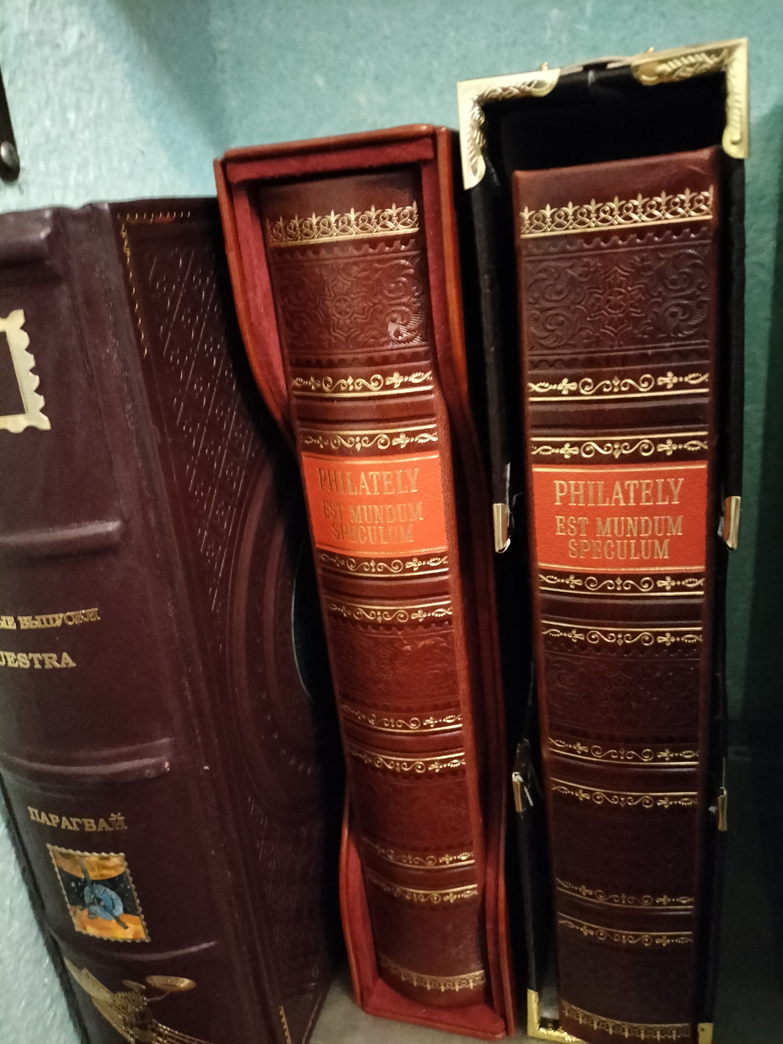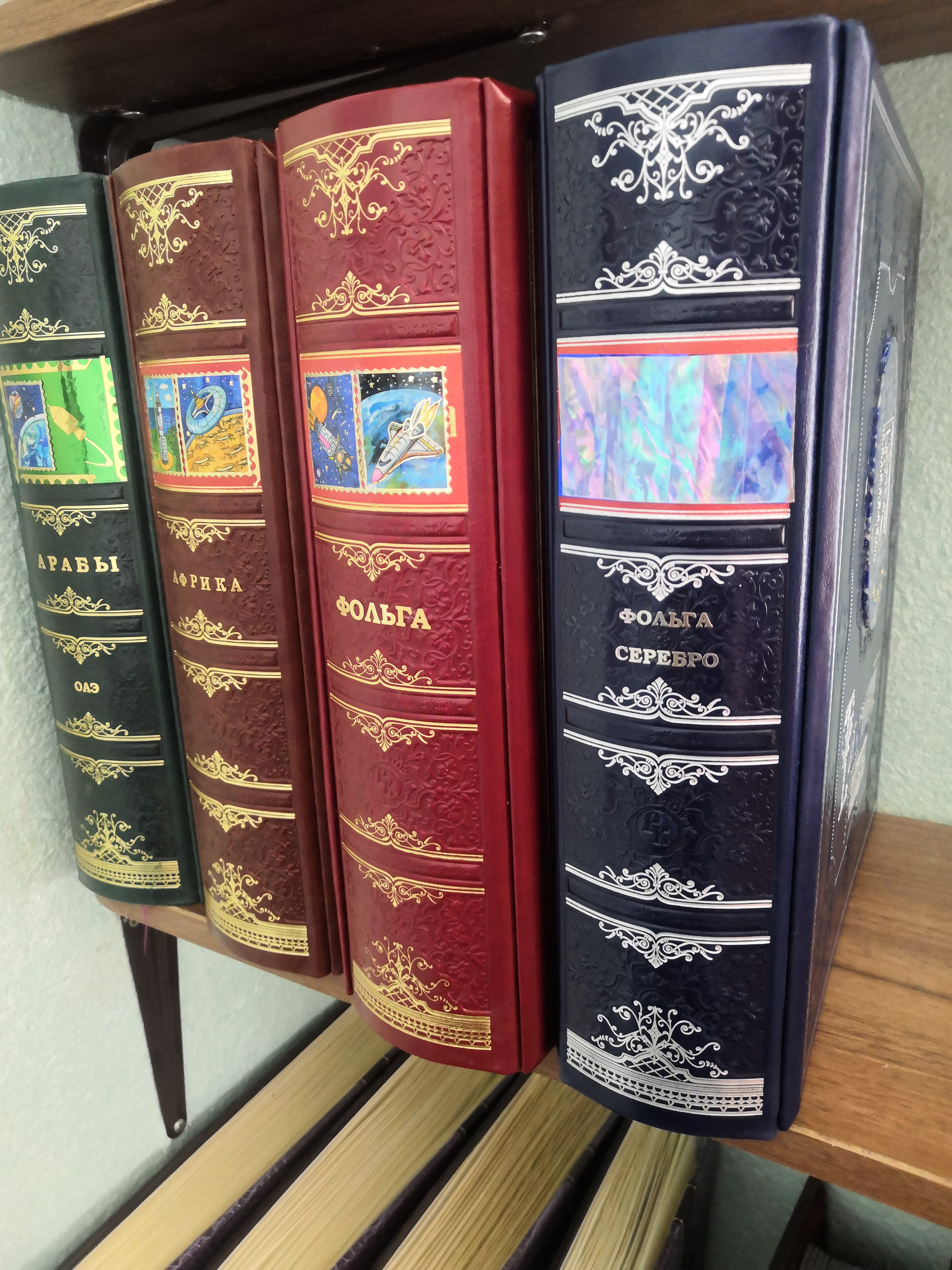 Альбом получился как фолиант, а вместе 4 альбома равноценны 13-15 большим советским кляссерам. Целый шкаф с марками удалось поместить на одну полку!