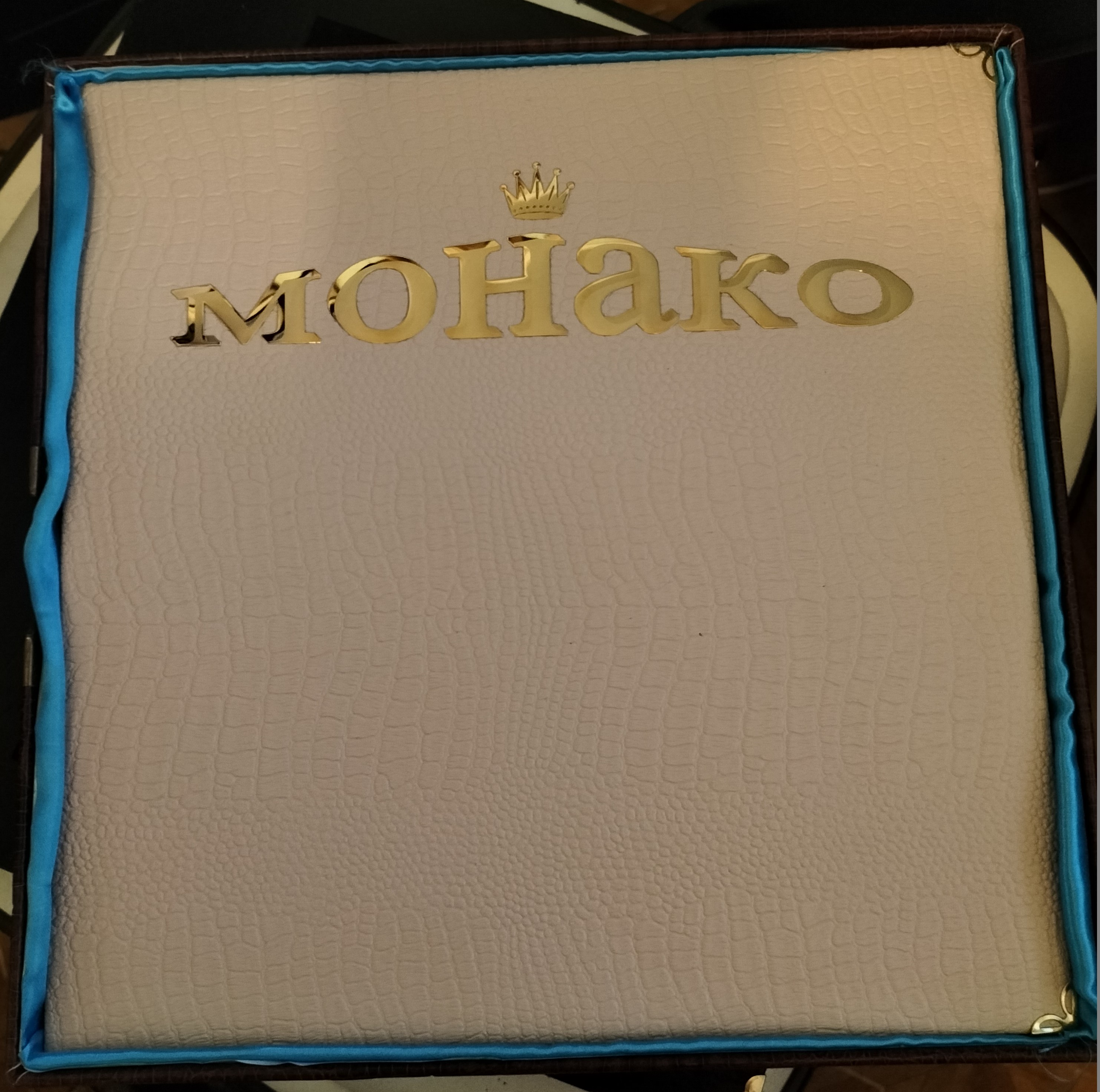 На оболочку для альбома « Арабы» пошла "Родовая книга" под названием «Малахит» фирмы "Тривеста" (Москва). Ну чтобы название не пропадало втуне, на лицевую сторону пошла малахитовая вставка (из плисового малахита!!!) с изображением мечети и суры Корана под золота. Плисовый малахит очень тяжело полируется и практически нереально найти изделие из полированного плисового малахита. Как коллекционный материал, в виде сырья – да, но не изделие.